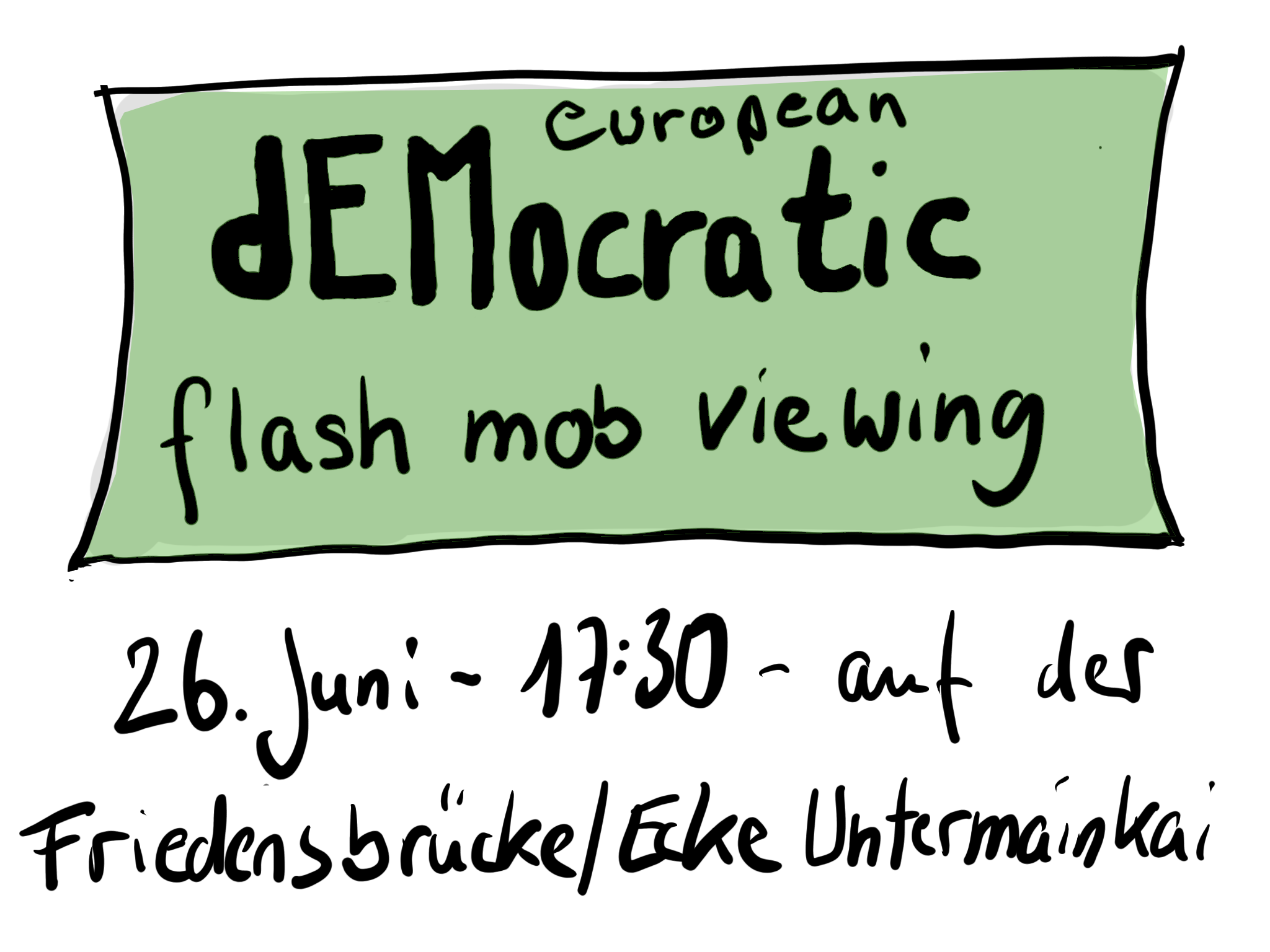 Wir laden zum European Democratic Flashmob Viewing am 26. Juni 2024 ein, um Fußball, Demokratie und die Europäische Einheit zu feiern. Treffpunkt ist vor dem Anpfiff um 17:30 Uhr auf der Frankfurter Friedensbrücke/Ecke Untermainkai.