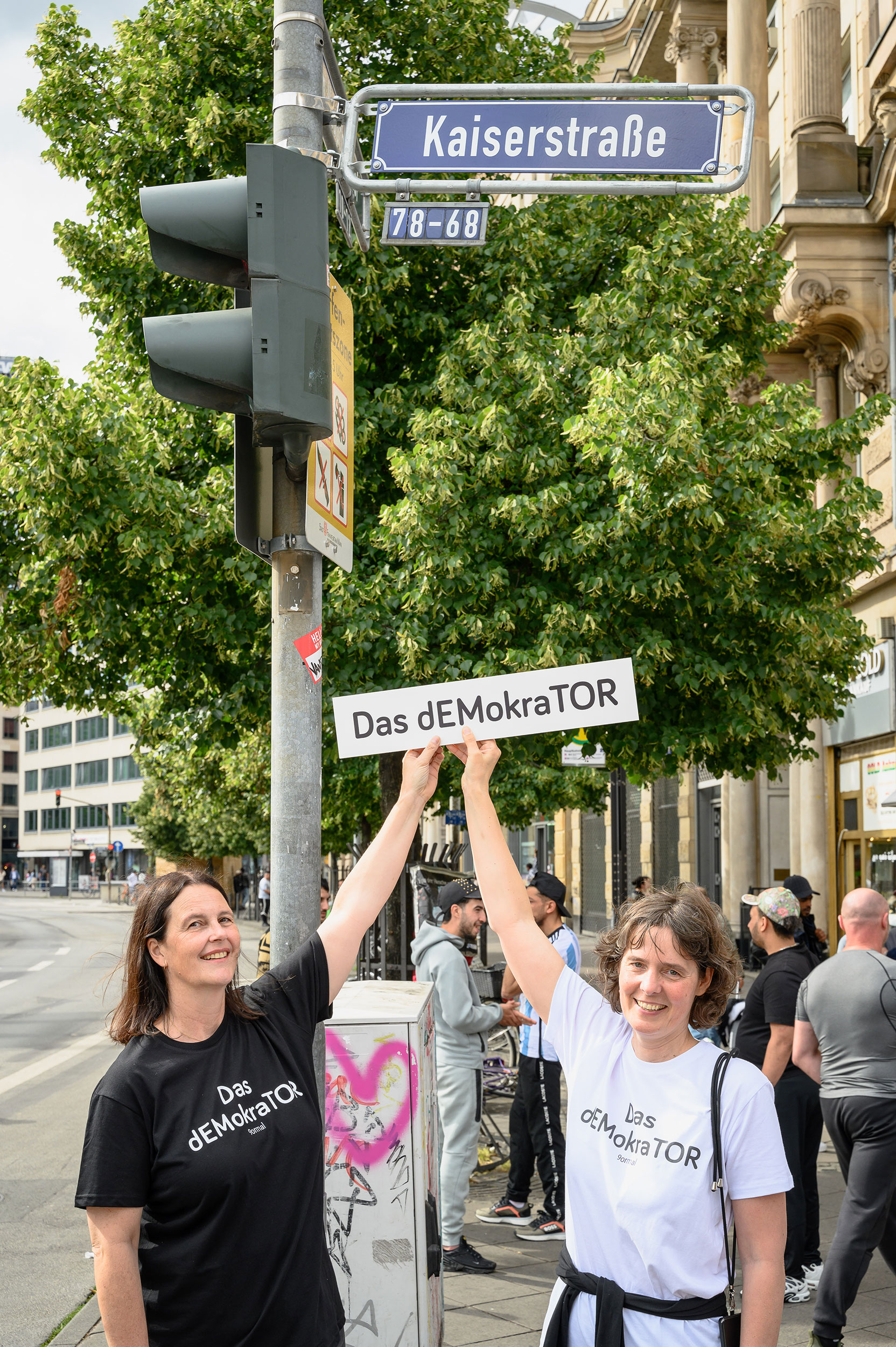 Wir verleihen den Kulturtitel dem neu entstandenen Kaisertor und würdigen damit seine Bedeutung als verbindender Ort zwischen dem Hauptbahnhof und dem Herzen der Stadt. Das Kaisertor ist Auftakt der Kaiserstraße, die als demokratischer Raum erhalten und gepflegt werden muss. Hier sollen sich Gäste und Einheimische sowie unterschiedliche soziale und kulturelle Gruppen begegnen und verständigen. Um dies sichtbar zu machen, möchten wir jedes Kaiserstraßenschild mit Das dEMokraTOR untertiteln. Die Kaiserstraße wird nicht verdeckt. Monarchie und Demokratie sollen als Optionen sichtbar nebeneinanderstehen – mit einem gleichsam naheliegenden wie mahnend-klaffenden Spalt dazwischen. So möchten wir die wechselhafte und wertschätzend gepflegte Tradition der Neurahmung und Umbenennung der Kaiserstraße weiterführen. Anstelle einer Guerilla-Aktion beantragen wir hiermit öffentlich, dass die Stadt unseren Impuls verstätigt.