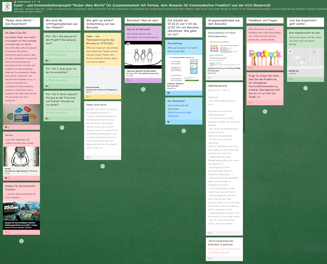 Das digitale Barcamp zum Thema Reden Ohne Worte mitten im Lockdown im Februar 2021 ist ein Versuch: Bisher hat die KGS Niederrad keine Erfahrungen mit digitalen Workshop-Veranstaltungen gesammelt. Sie betritt damit sowohl methodisch als auch technisch Neuland. Sie betritt damit methodisch und technisch Neuland. Am Ende des Barcamps melden die Teilnehmer*innen jedoch Erfolg (“Das beste, was wir je gemacht haben! Geht das jetzt weiter so?”), die Ergebnisse sprechen für sich und die KGS diskutiert weitere Schritte: