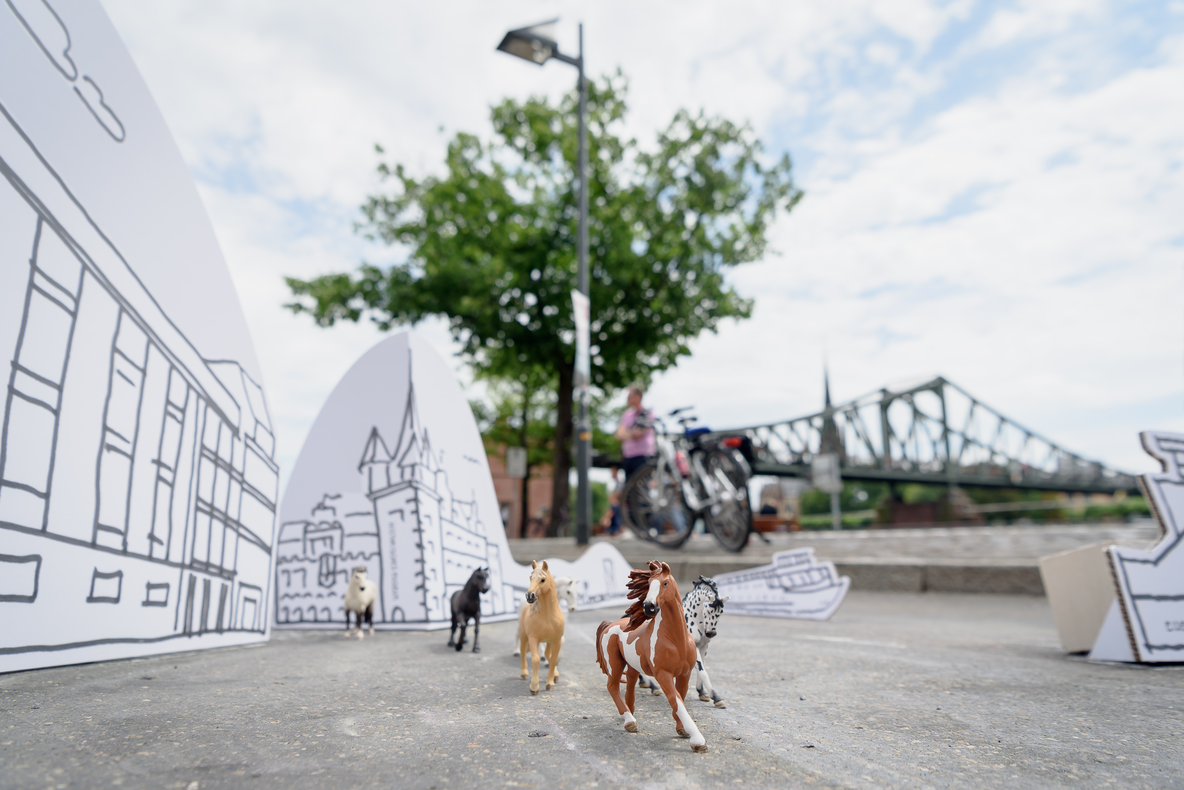 Wir forderten dazu auf, diese Perspektive mit eigenen Ideen neu zu definieren. Das Panorama des Bastelbogens wurde am Mainkai als Asphalt-Tattoo mehrfach auf die Straße gesprüht und erzeugte Aufmerksamkeit für den Ort. An zwei Aktionstagen ergänzten Pappaufsteller die Installationen auf dem Asphalt. Sie konnten von Passanten mit Kreide gestaltet werden.
